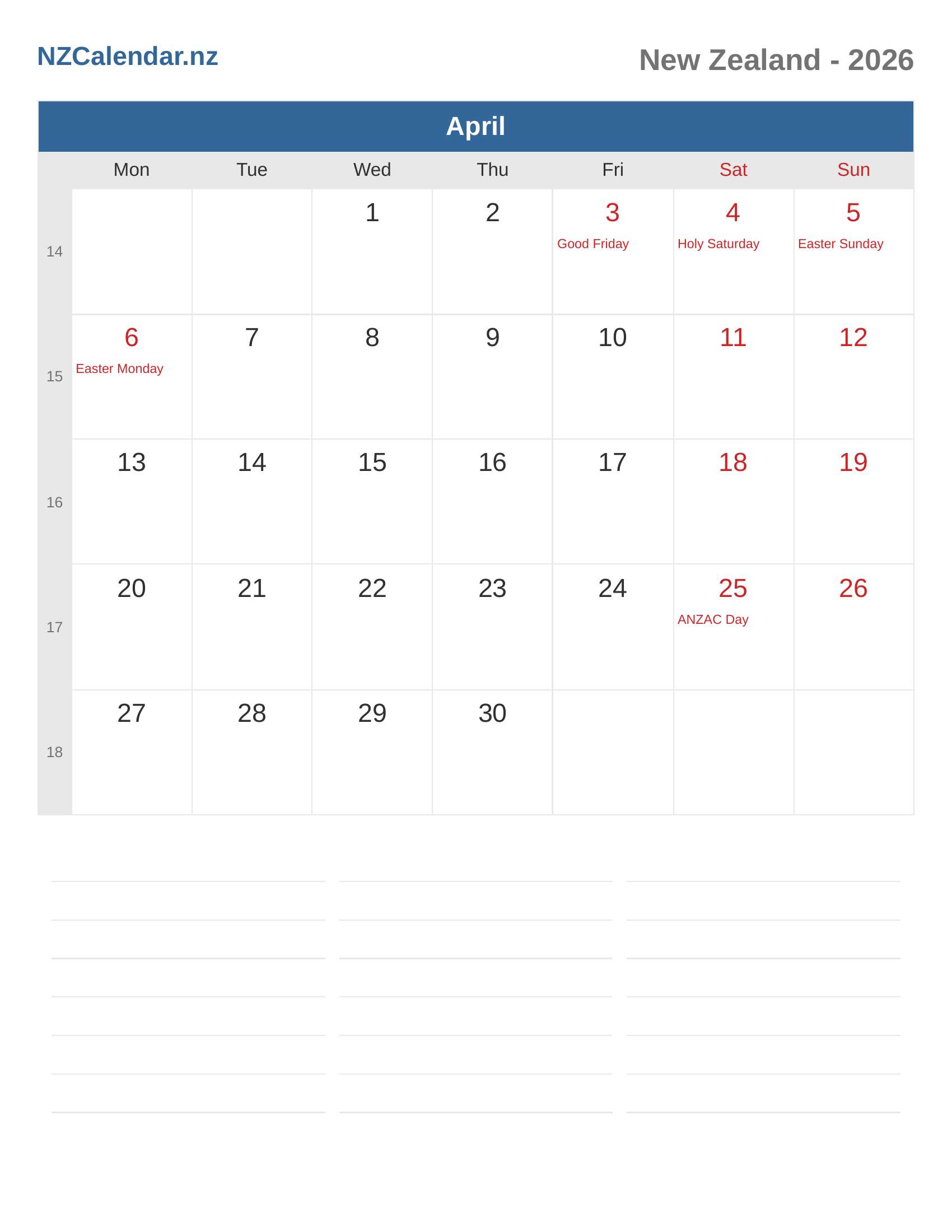 New Zealand Calendar 2026 - April