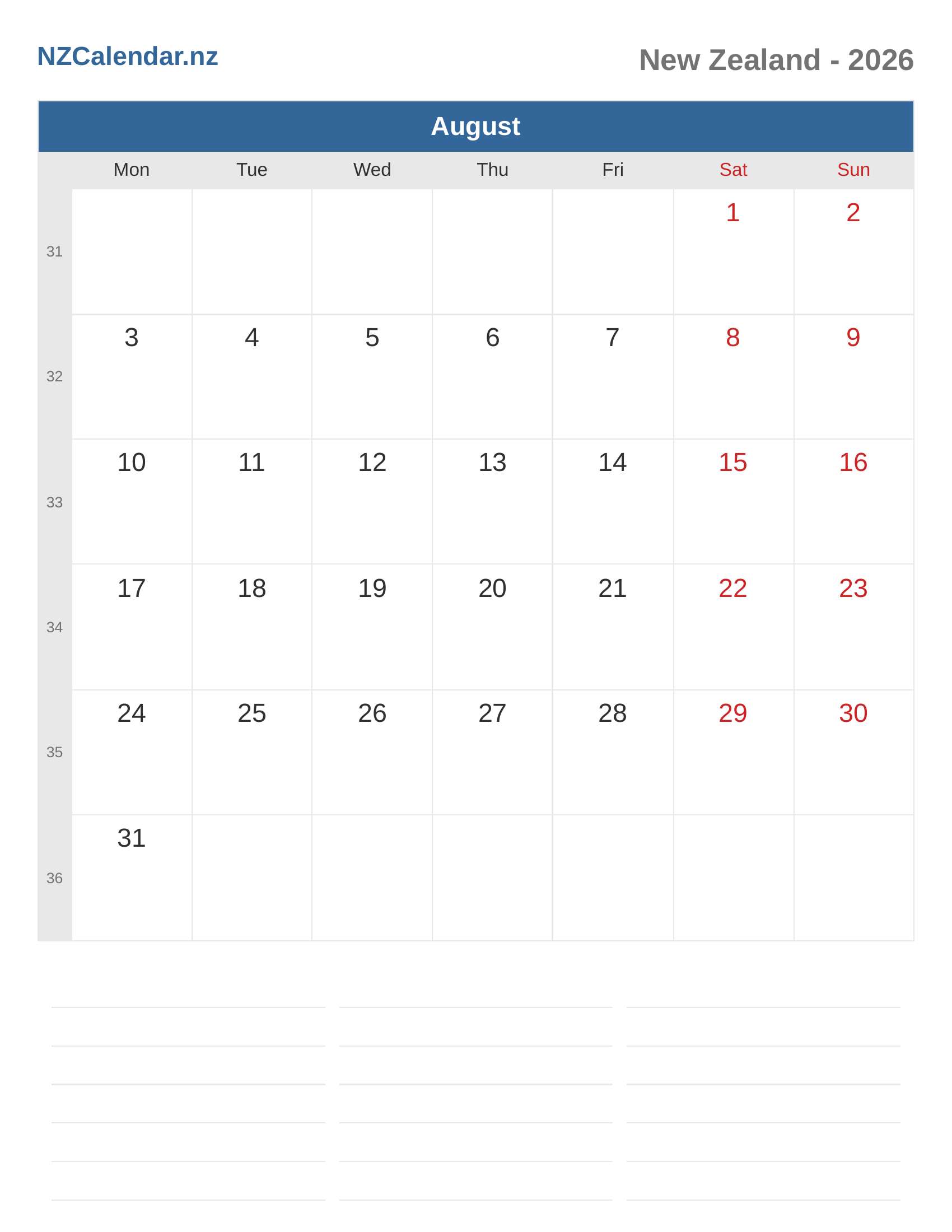 New Zealand Calendar 2026 - August