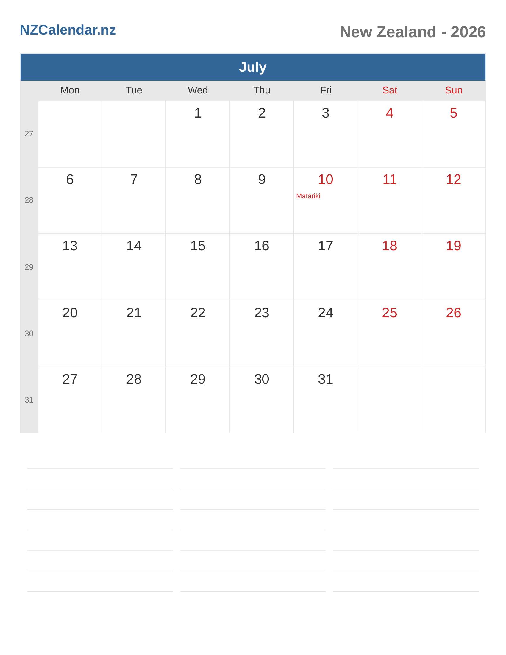 New Zealand Calendar 2026 - July