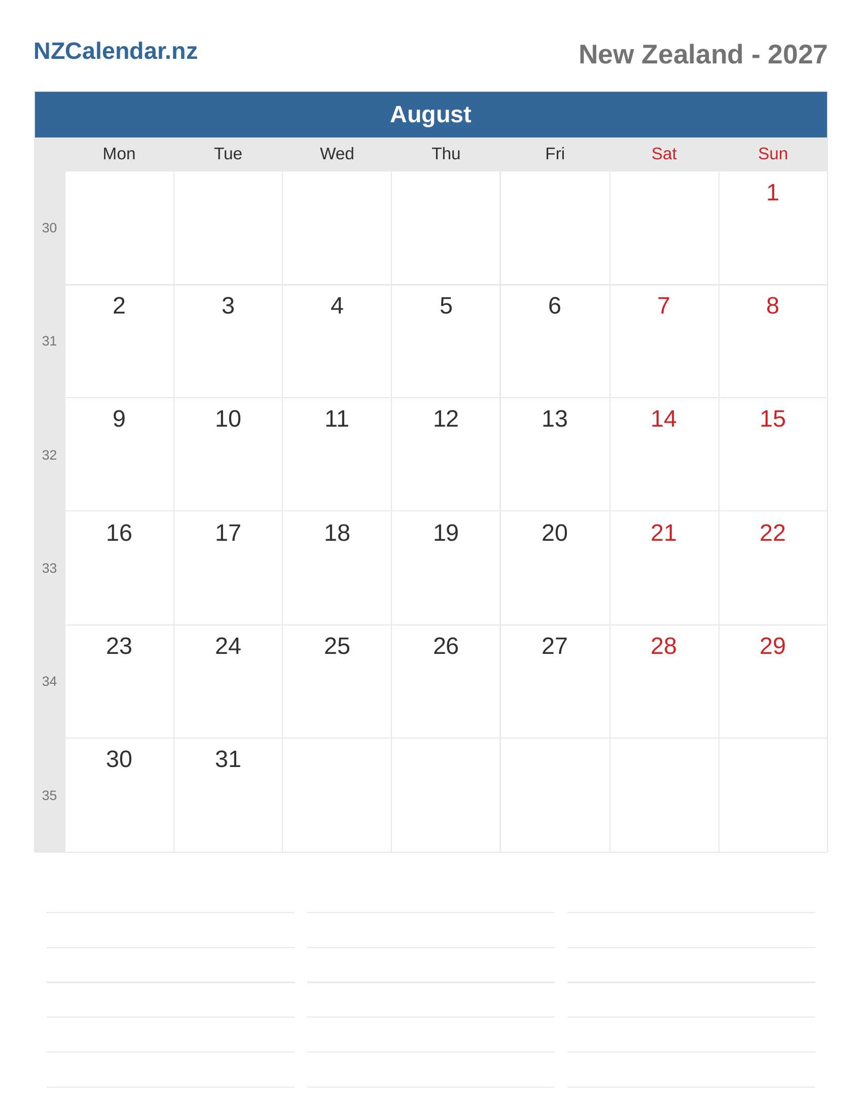 Calendar August 2027 - New Zealand